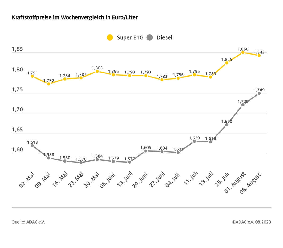 Gesunken ist hingegen der Benzinpreis, wenn auch nur geringfügig. Laut ADAC kostet ein Liter Super E10 im Schnitt 1,843 Euro und damit um 0,7 Cent weniger als vor Wochenfrist. Im Laufe der vergangenen vier Wochen hat sich Benzin damit um 4,8 Cent verteuert.
