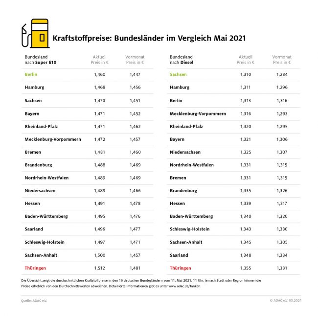 München (ots) – In Thüringen bleibt Sprit weiter teuer. Bereits in der letzten ADAC Auswertung der Kraftstoffpreise in den 16 Bundesländern rangierte Thüringen als teuerstes Bundesland. Auch diesmal hat Thüringen den negativen Spitzenplatz inne. Ein Liter Super E10 kostet hier 1,512 Euro und damit nochmal mehr als im Vormonat (1,481 Euro). Bei Diesel liegt der Literpreis…
