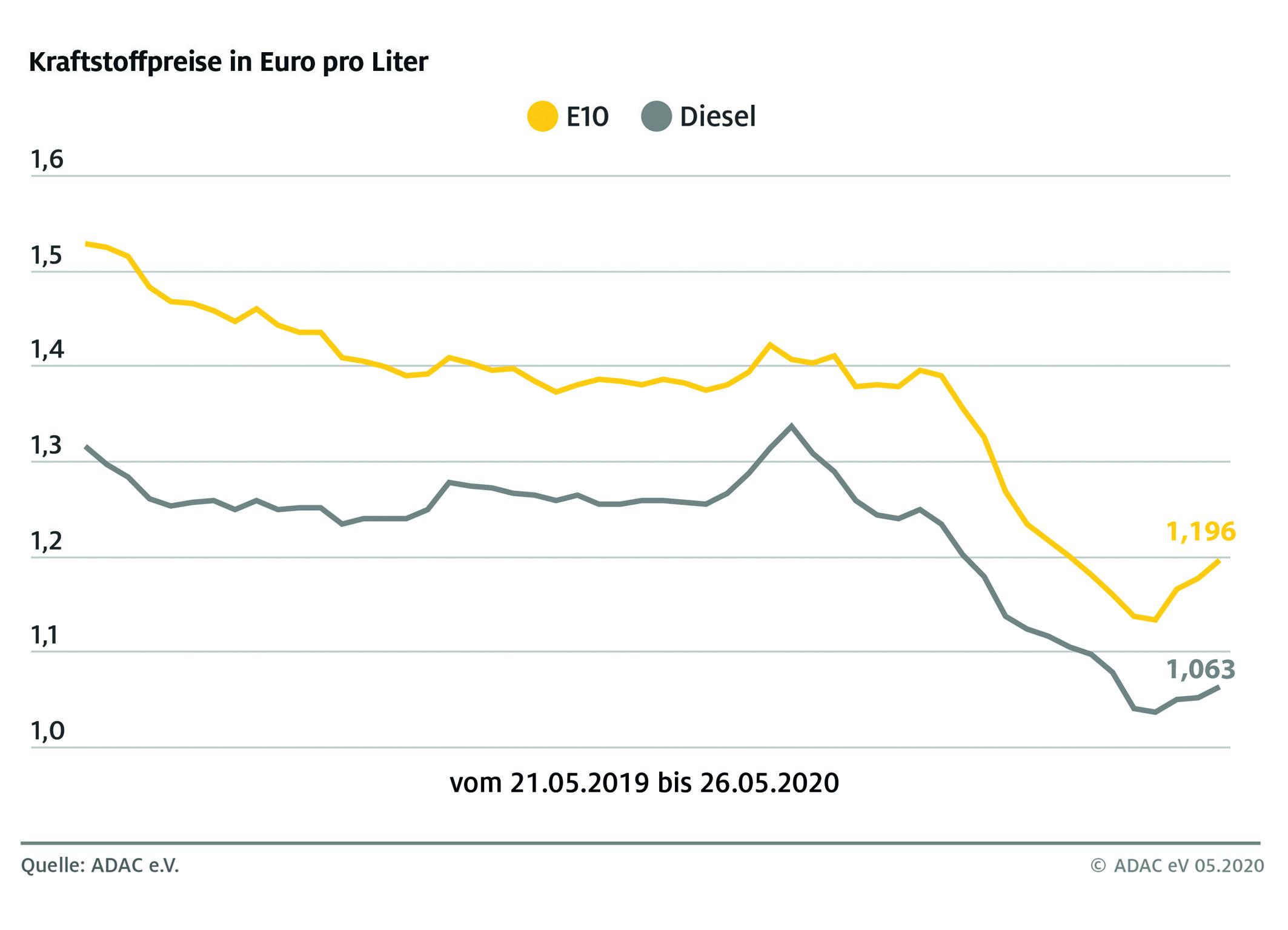 München (ots) – Die Zeit sinkender Kraftstoffpreise scheint vorbei. Laut aktueller Auswertung des ADAC müssen Autofahrer für einen Liter Super E10 im Bundesdurchschnitt 1,196 Euro bezahlen, das sind 1,9 Cent mehr als in der Vorwoche. Diesel verteuerte sich um 1,1 Cent auf durchschnittlich 1,063 Euro je Liter. Das ist bereits der dritte Wochenanstieg in Folge. Im Vergleich zu den Preisen vor der Coronakrise ist Tanken im Bundesschnitt dennoch rund 10 Cent je Liter billiger.