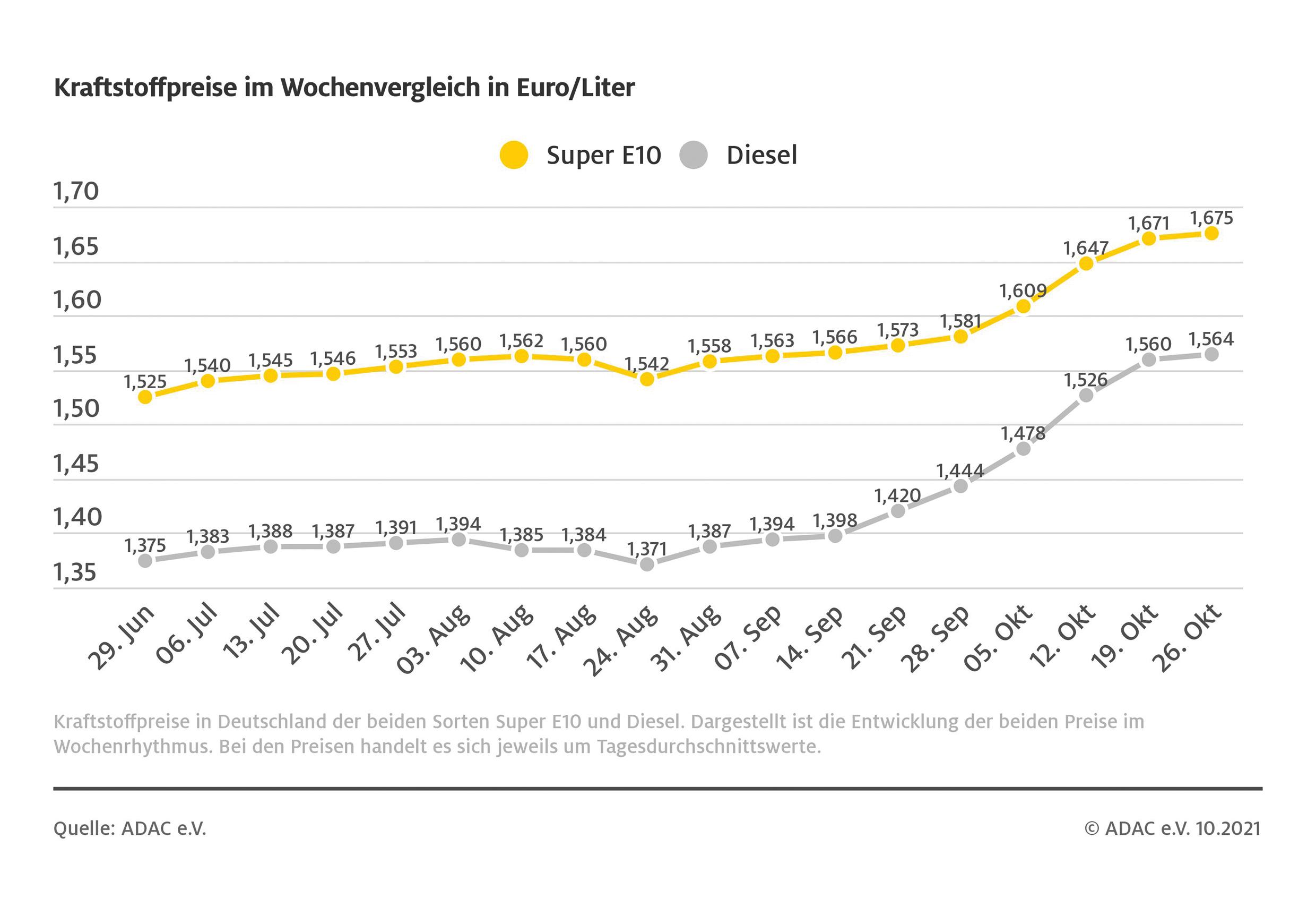Die Kraftstoffpreise in Deutschland erreichen neue Höhen: Wie die Auswertung des ADAC ergibt, klettert der Preis für den Liter Super E10 binnen Wochenfrist um 0,4 Cent weiter auf 1,675 Euro und übertrifft damit alle Tagesdurchschnittspreise seit neun Jahren. Damals lag der Preis für Super E10 in der Spitze bei 1,709 Euro je Liter. Auch der Dieselpreis steigt im Vergleich zur Vorwoche erneut: Der Preis beim Selbstzünderkraftstoff beläuft sich auf 1,564 Euro je Liter – 0,4 Cent mehr als vor einer Woche.