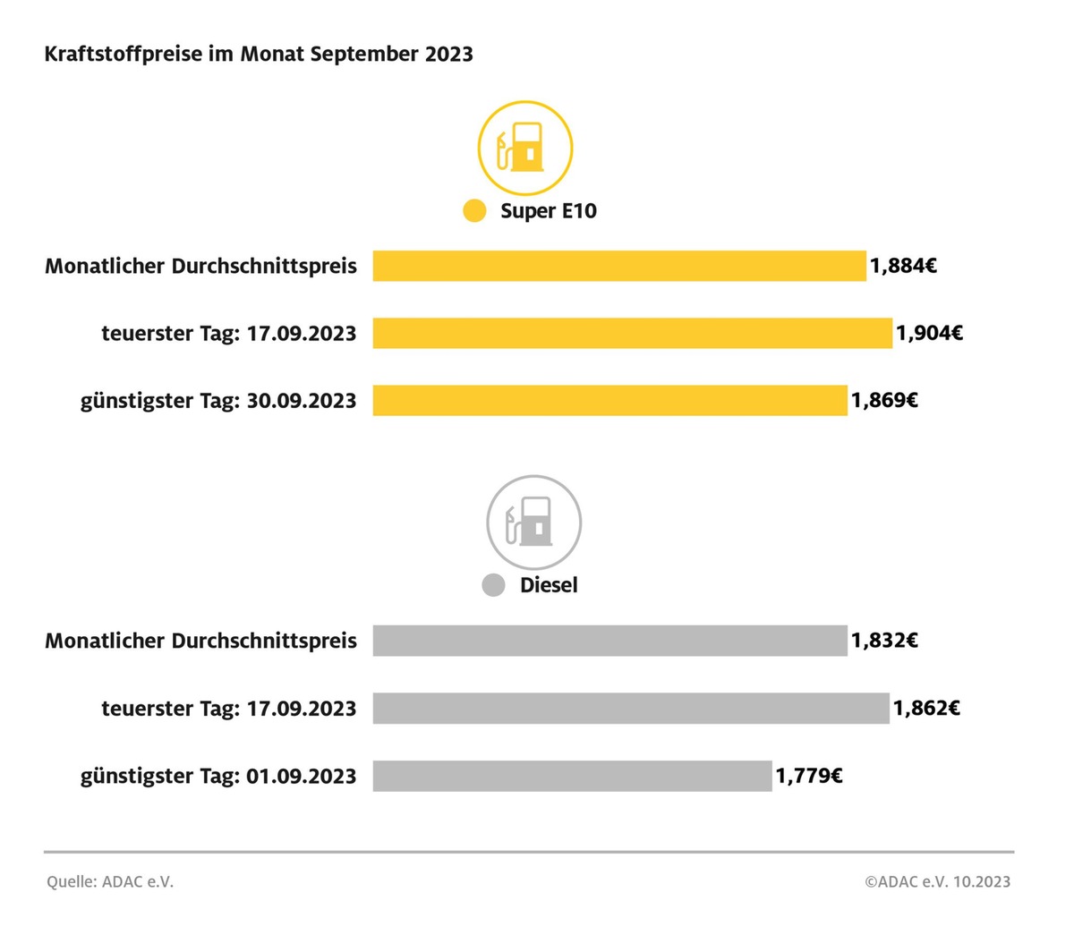 Der teuerste Tag an den Zapfsäulen war für beide Sorten mit dem 17. September fast in der Monatsmitte, mit 1,904 Euro für Super E10 (Jahreshöchststand!) und 1,862 Euro für einen Liter Diesel im bundesweiten Durchschnitt.