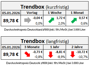 Die genannten Heizölpreise beziehen sich stets auf den deutschlandweiten Durchschnittspreis bei einer Bestellung von 3.000 Liter Heizöl Standard schwefelarm inklusive 19% MwSt. Außerdem fallen durch Transportkosten die Preise regional unterschiedlich aus. Stand der Preise 05.01.2026
