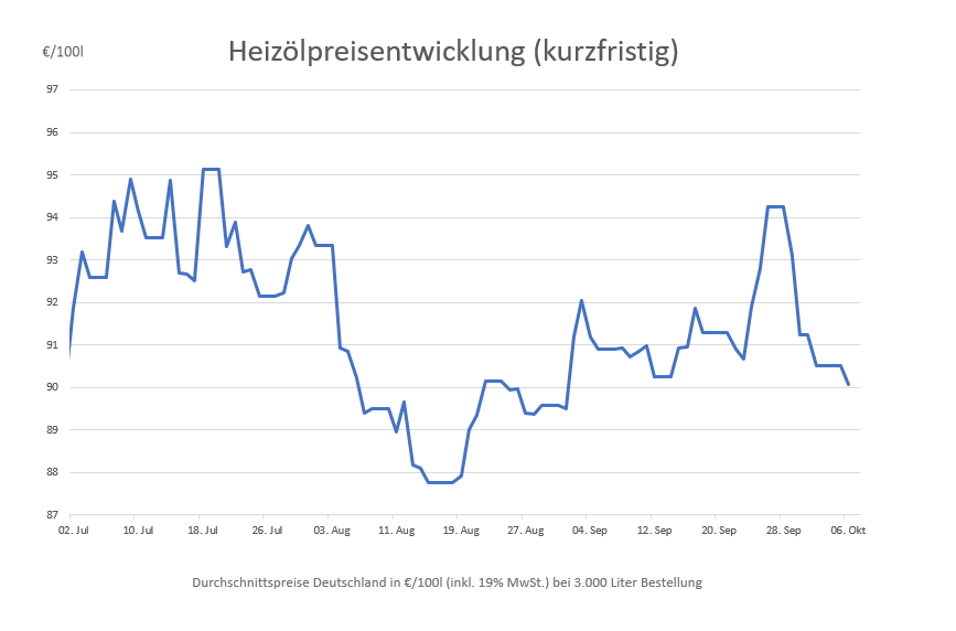 So zahlen Verbraucherinnen und Verbraucher im bundesweiten Durchschnitt etwa 0,43 Euro weniger als noch am Donnerstagvormittag. Im Vergleich zum letzten Montag wird der Preisrückgang sogar noch deutlicher, denn am 29. September lag der Durchschnittspreis mit 93,11 Euro pro 100 Liter insgesamt 4,17 Euro höher als heute. Der steile Preisanstieg aus der letzten Septemberwoche ist damit also erst einmal wieder passé und die Heizölpreise wieder auf dem Niveau von Anfang September.