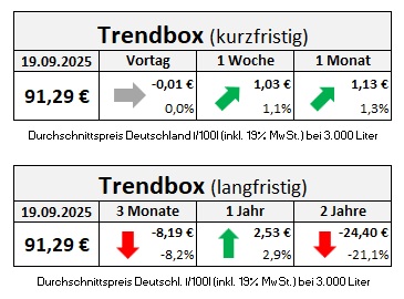 In der vergangenen Woche war der Montag mit 90,94 Euro für 100 Liter der günstigste Tag für den Heizölkauf. Der Mittwoch wiederum war mit 91,87 Euro der teuerste Tag, um die Heizölvorräte aufzufüllen.