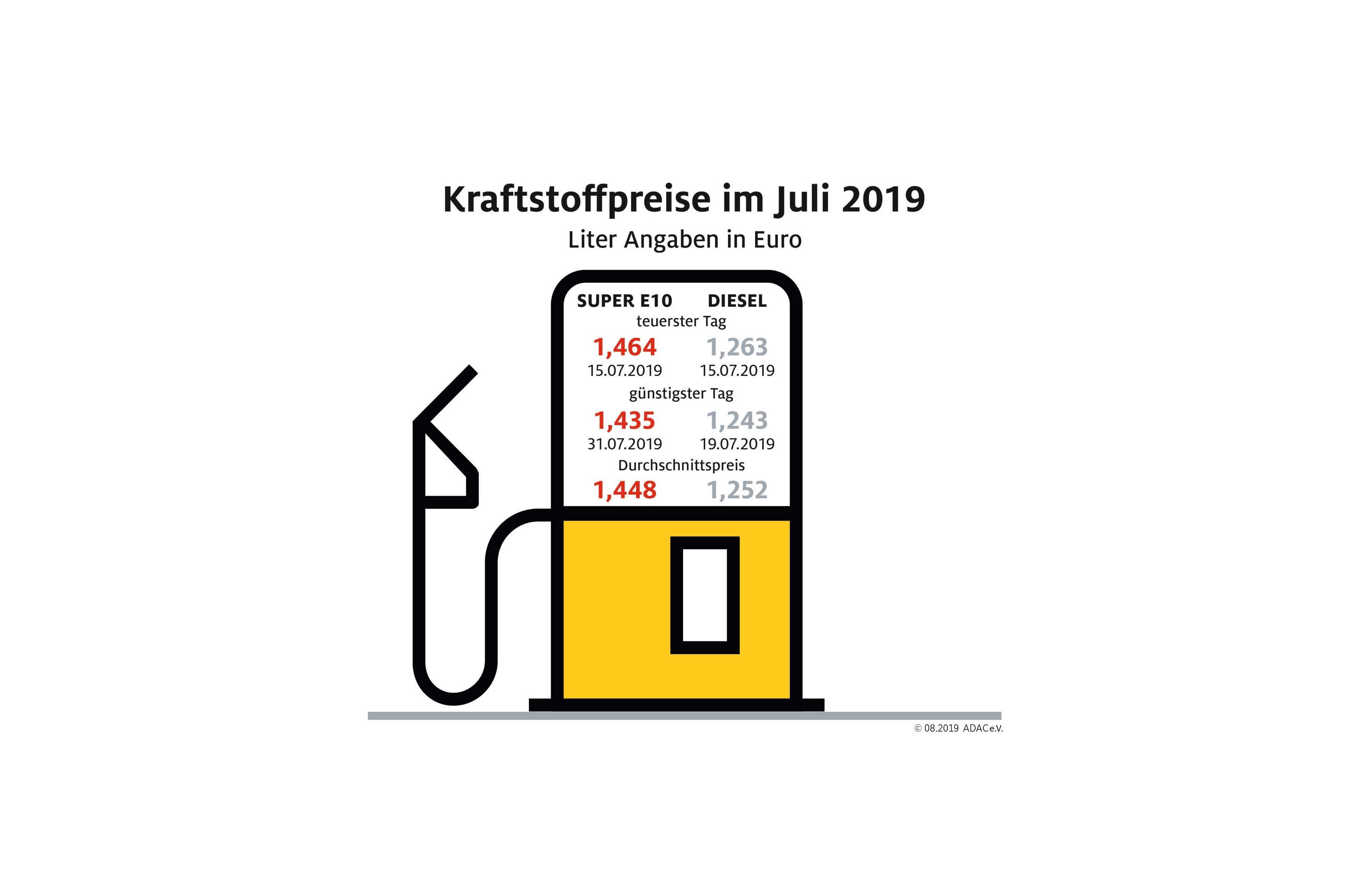 Der Rückgang der Kraftstoffpreise setzt sich fort. Autofahrer konnten im Juli den zweiten Monat in Folge billiger tanken. Laut der monatlichen Marktauswertung des ADAC kostete ein Liter Super E10 im Monatsmittel 1,448 Euro und damit 3,0 Cent weniger als im Juni. Diesel verbilligte sich gegenüber dem Vormonat um 0,9 Cent auf durchschnittlich 1,252 Euro je Liter.