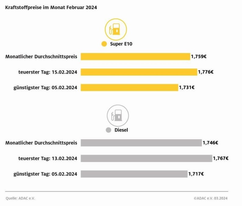 Am teuersten war Super E10 am 15. Februar mit 1,776 Euro je Liter. Günstigster Tag für E10 war der 5. Februar mit durchschnittlich 1,731 Euro. Der Dieselpreis war am 13. Februar mit 1,767 Euro am höchsten. Billigster Tag war ebenfalls der 5. Februar mit 1,717 Euro.