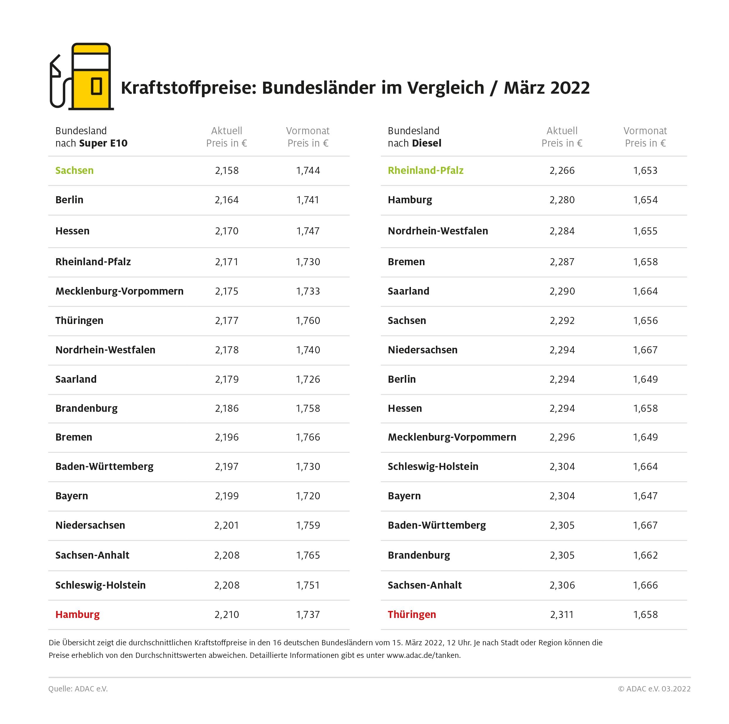 München (ots) – Die Kraftstoffpreise sind deutschlandweit auf Rekordniveau, doch in einzelnen Bundesländern registriert der ADAC zurzeit besonders hohe Werte. Wie die aktuelle ADAC Auswertung der Kraftstoffpreise in den 16 Bundesländern zeigt, kostet ein Liter Super E10 aktuell in Hamburg mit 2,210 Euro am meisten. Nur unwesentlich günstiger ist E10 in Schleswig-Holstein und Sachsen-Anhalt mit 2,208 Euro je Liter. Um 5,2 Cent günstiger ist Tanken hingegen in Sachsen, wo ein Liter E10 mit 2,158 Euro zu Buche schlägt. Weitere Bundesländer, in denen Benzin etwas preiswerter ist, sind Berlin mit 2,164 Euro je Liter Super E10 und Hessen mit 2,170 Euro.